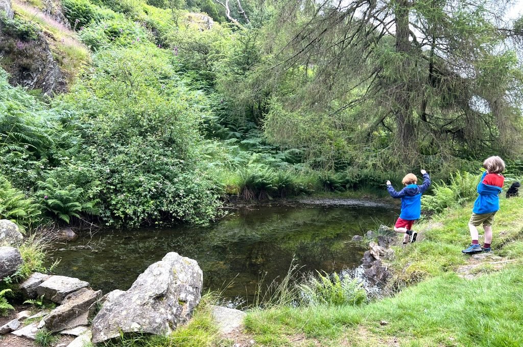 Mr Alcock enlarged the tarn using a stone and earth dam, making it larger and deeper, and then filled it with brown trout. We didn’t see any trout on our visit, but we saw plenty of tiny fish around the edges!