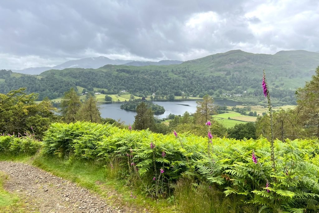 9. From the pond, the path keeps climbing, with lots and lots of ferns either side. Make sure you stop top and enjoy the view over Grasmere village and lake, and across to (which fells?).