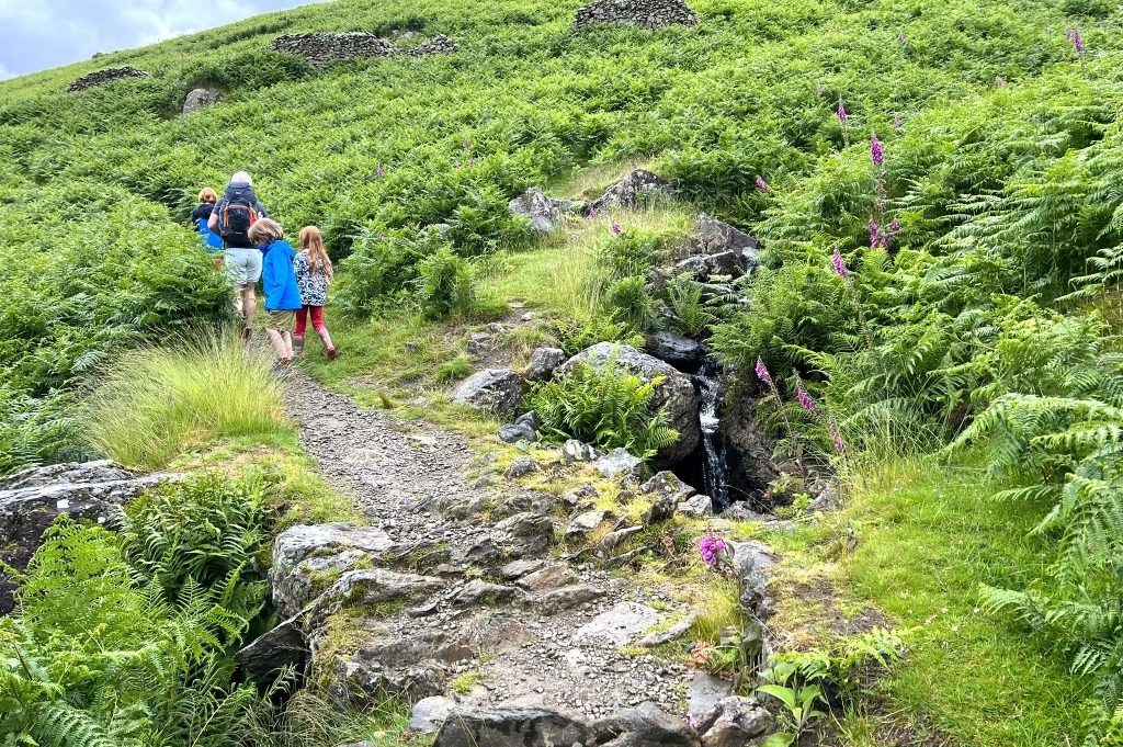 13. Past the waterfall section, you will cross over a tiny stone bridge, where the path continues to climb up the fell.