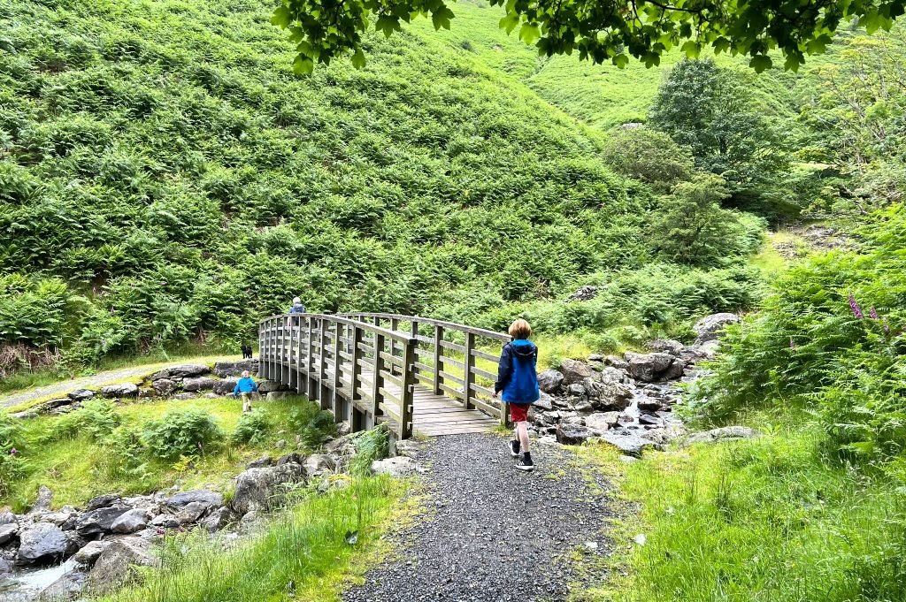 18. Now time for the descent. Continue to follow the path which leads down the hill. This is steep and can be slippy if it’s been raining (and this is the Lake District so it’s fairly likely!) so take care here. You will eventually arrive at a footbridge, which you should cross.