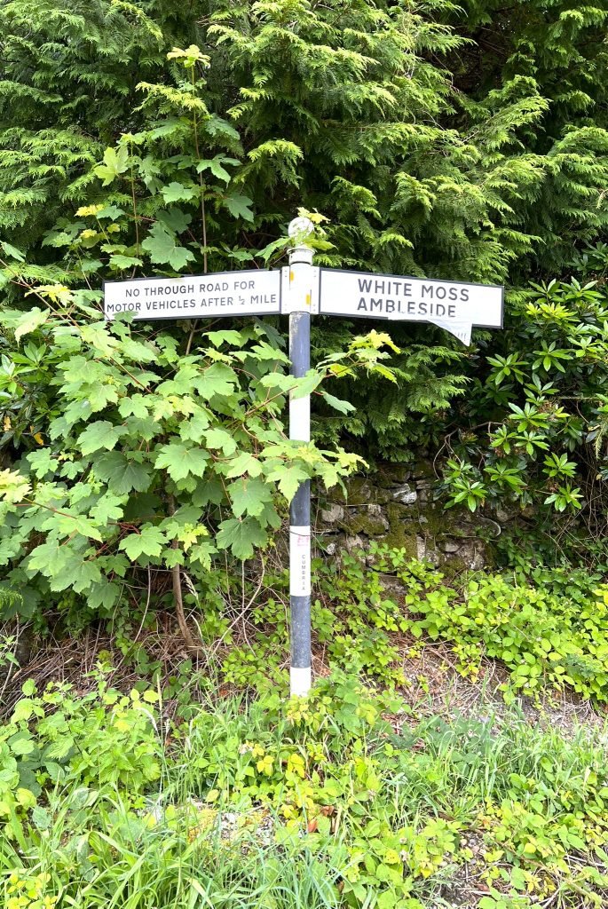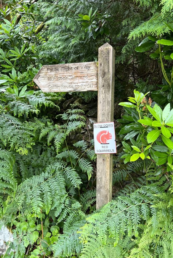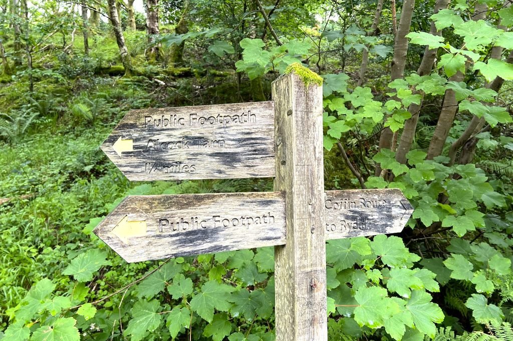 2. Keep walking along this road. It will eventually open up and you will come to a crossroads( where you will see a signpost for a public right of way to Alcock Tarn. Follow the sign to your left.