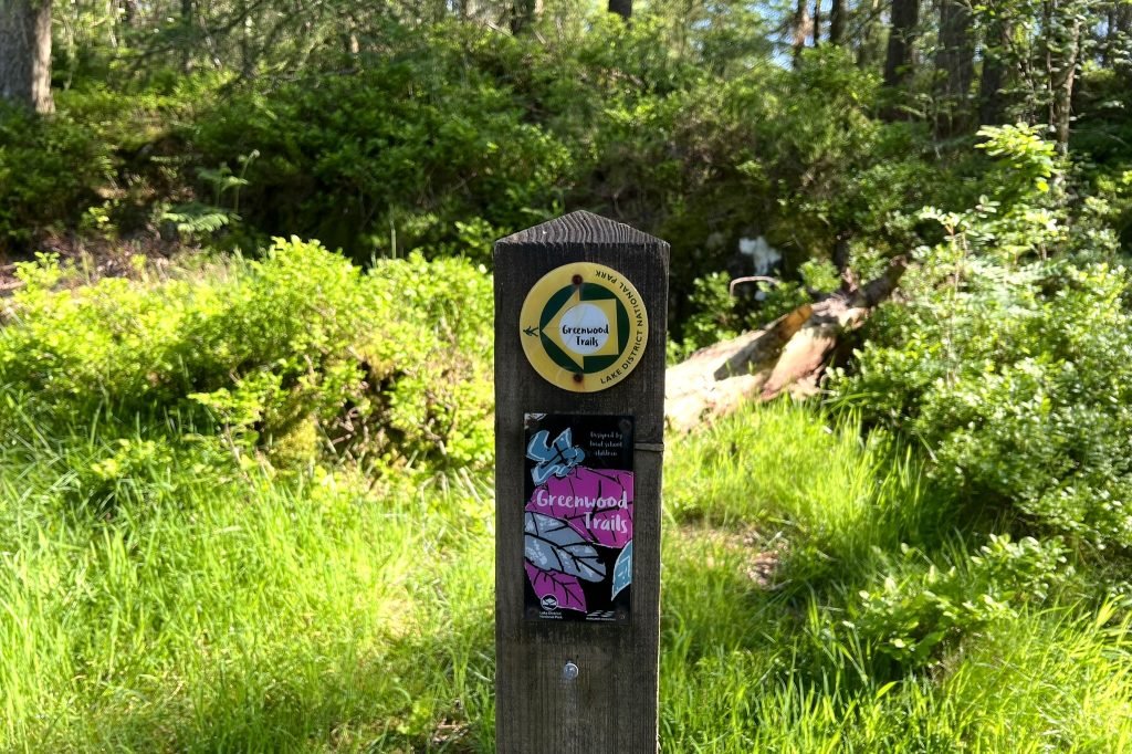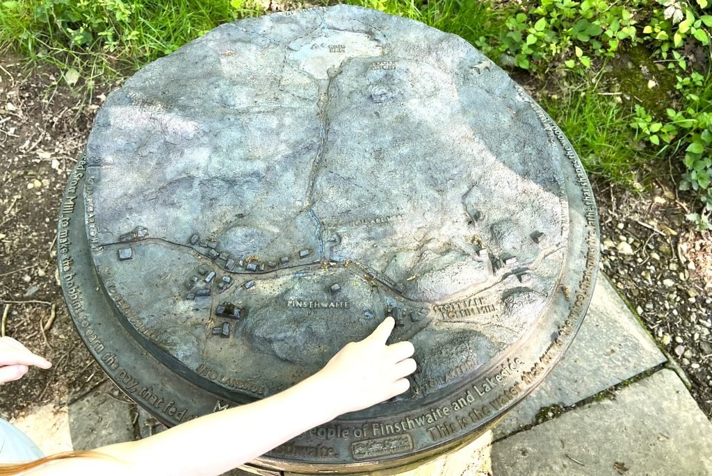 1. The walk starts at High Dam Car Park. Here you’ll see the giant bobbin (from Stott Park Bobbin Mill) with a carved relief map on the top, showing the path up to High Dam past Low Dam. Take the path from the entrance of the car park, leading up the hill.