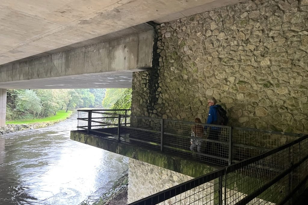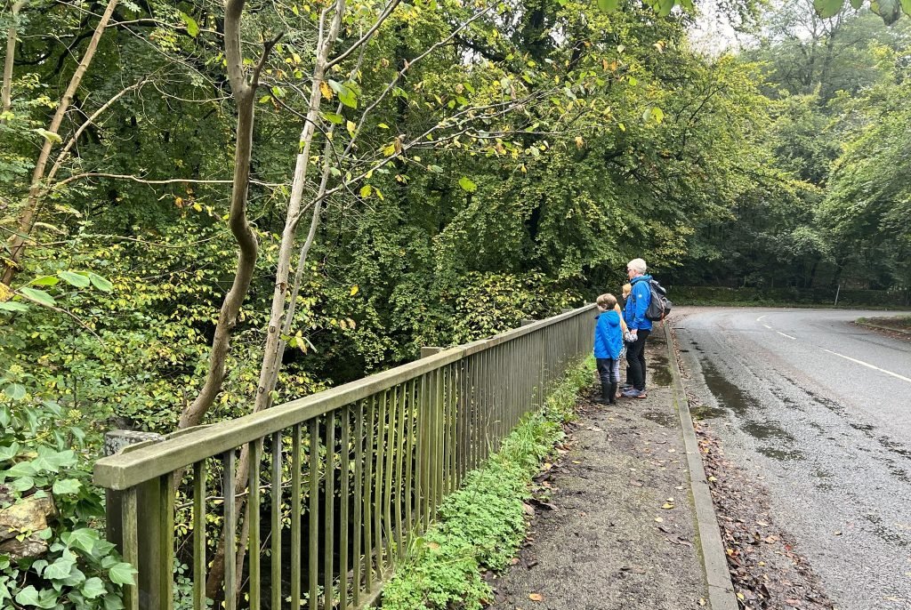 7. Continue to follow this road (this is the exact bit where my children start to flag, then they pick up a bit on the next section) until it joins another road. Turn left here onto the road bridge with railings. The river underneath can look pretty wild here, it’s worth stopping and watching for a minute.