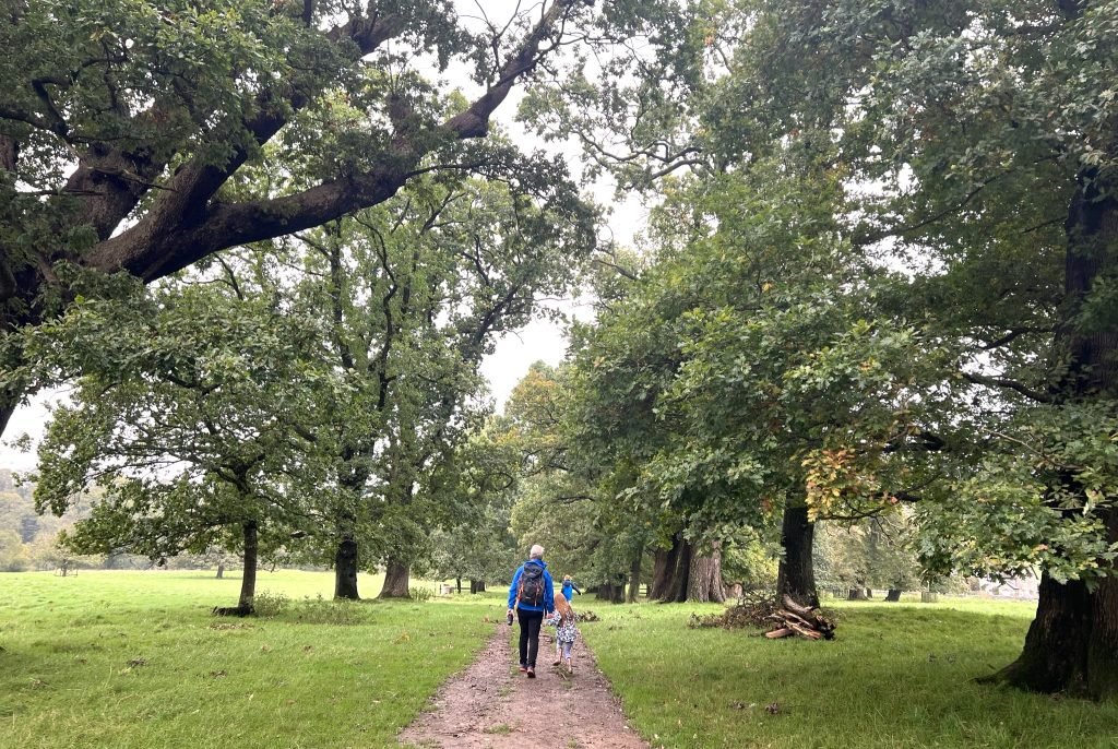 5. The path continues through the deer park. It is well marked, and mainly flat. Look out here for different bird species, and the impressive trees lining the walk. Along the flat straight section there is a hollow tree that my children love to climb inside!