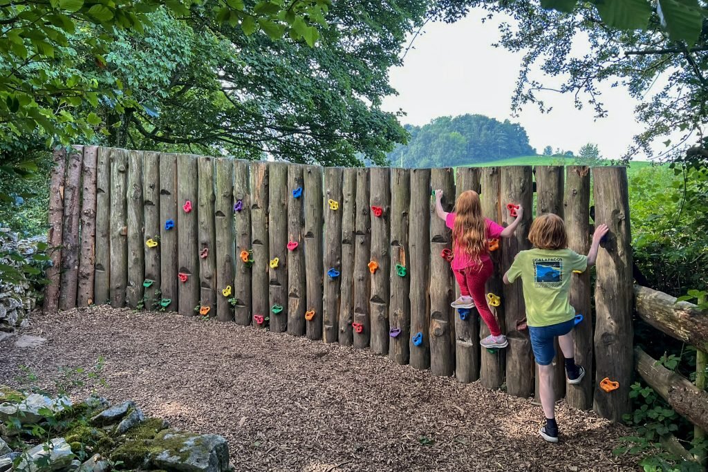 Go over the stile, and follow the path as it leads you to the right, alongside the wall. A short way along you’ll find the real start of the trail, where you’ll find a climbing wall.
