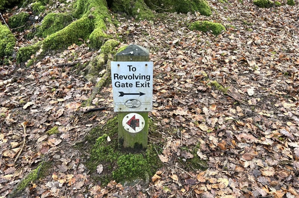 5. As the path heads up hill, you will come to a picnic bench with the sign behind it saying ‘To Revolving Gate Exit’. Follow this path until it brings you to a revolving gate, which leads out onto the road. Turn left on to the road.