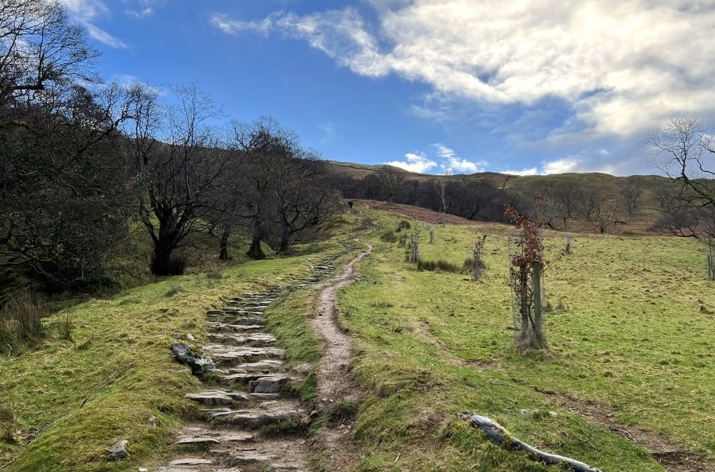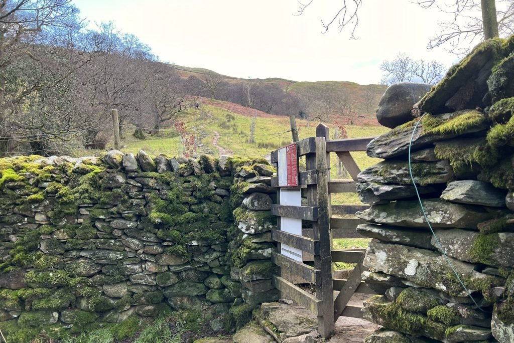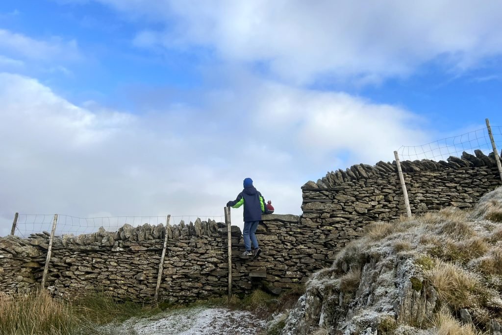6. Walk up the road, and in less than 5 minutes you’ll see steps up to a stile on the wall on your right hand side. This is also clearly signposted ‘Wansfell Pike’. Go up the steps and over the stile – there is also a helpful dog gate – and take the clear path with the fence on your left. The terrain starts to become more uneven here, but at this point we were still skipping!