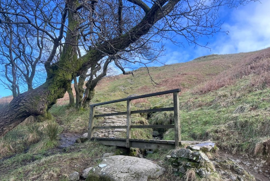 8. Continue on this path, right up the fell. Cross the wooden bridge over the beck when you come to it. Once you’re over the bridge, you will soon be higher than any tree cover, and you’ll have a huge view of the Lake District fells, including Coniston Old Man and the Langdales.